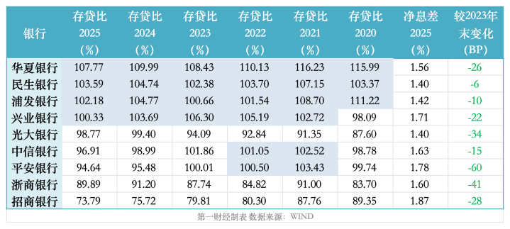 截至2025年末,华夏银行、民生银行、浦发银行、兴业银行的存贷比均在100%以上,而且连续多年“霸榜”。对比来看,国有四大行存贷比最高为91%左右,股份行里招商银行存贷比仅为73.79%。
