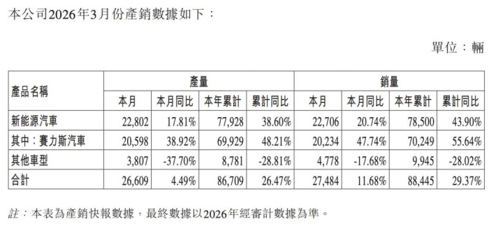 鸿蒙智行未公布2026年3月整体和问界的交付量数据,鸿蒙智行旗下的“五界”中,赛力斯集团在4月1日发布的产销快报显示,3月,赛力斯集团新能源汽车销量22706辆(同比增长20.7%),其中赛力斯汽车销量20234辆(同比增长47.7%)。